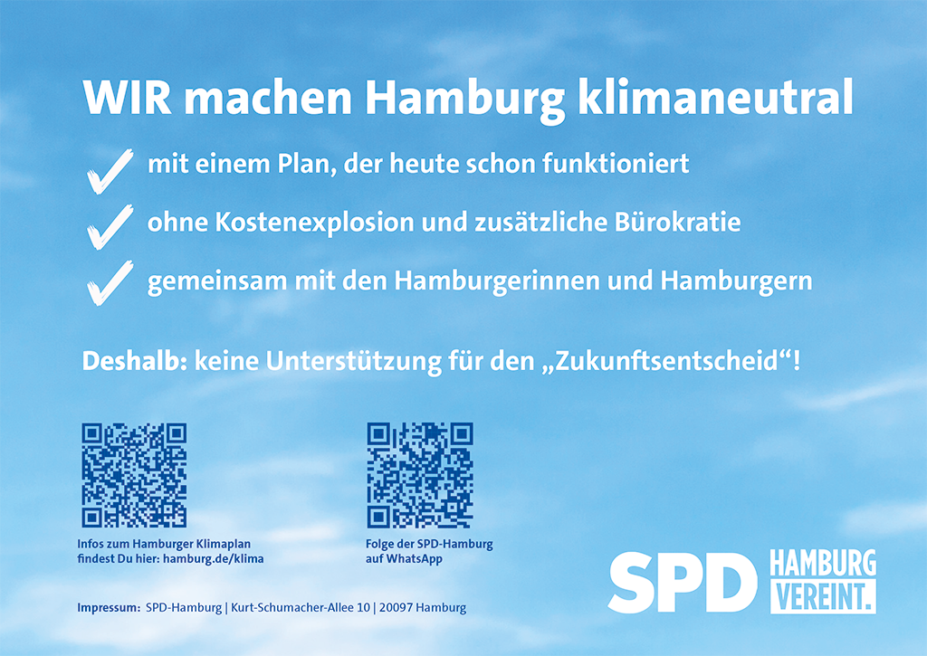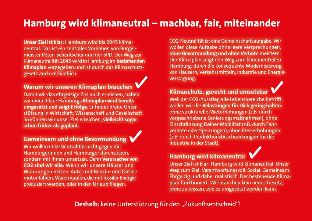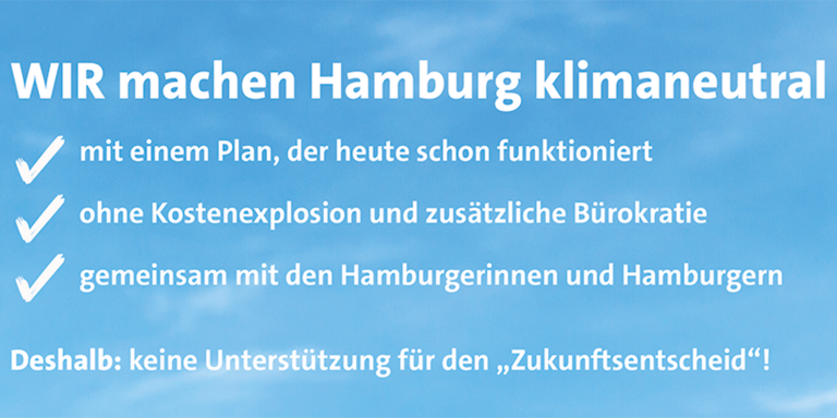 Hamburg verfolgt seine gesetzlich festgeschriebenen Klimaschutzziele bereits sehr konsequent. Warum wir die Ziele des sogenannten "Zukunftsentscheids" nicht teilen, erläutern wir in unseren Materialien.